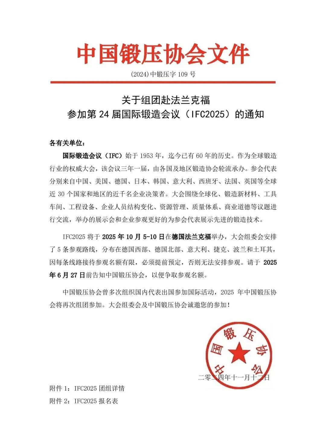 我司憑借在精密鍛造領域的技術積累和市場表現,獲得中國鍛壓協會的正式邀請,成為本次中國代表團的重要成員之一。這既是對我司實力的認可,也是展示中國鍛造水平的寶貴機會。